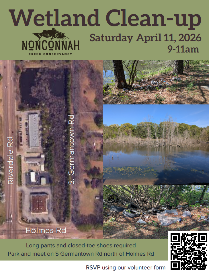 Join Nonconnah Creek Conservancy for a wetland clean-up in southeast Shelby County. We will be starting at 9am. If you are joining us, please wear long pants and closed-toe shoes.